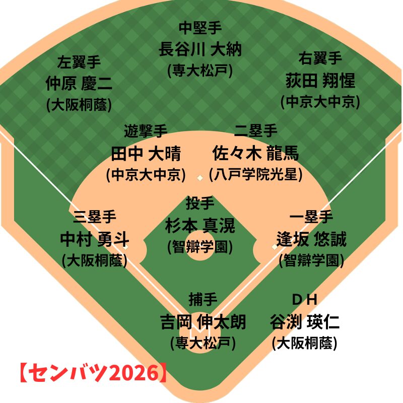 第98回選抜高校野球大会(センバツ高校野球2026)は大阪桐蔭高校の4年ぶり5回目のセンバツ優勝で幕を閉じました。今大会活躍した選手の中からベストナインを選んでみました。